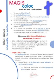 – Les membres de la colocation s’engagent à participer à une équipe MAGIS (une réunion par mois), et sont attentifs à s’insérer dans la vie de l’Église à Toulouse, notamment dans la pastorale des jeunes. L’équipe MAGIS est l’occasion d’une ouverture vers d’autres étudiant(e)s en lien avec la spiritualité ignatienne.