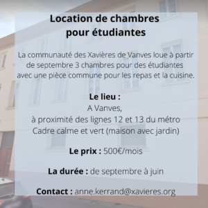 – Auprès de la communauté jésuite attenante à la colocation, participation possible à l’eucharistie et au repas.